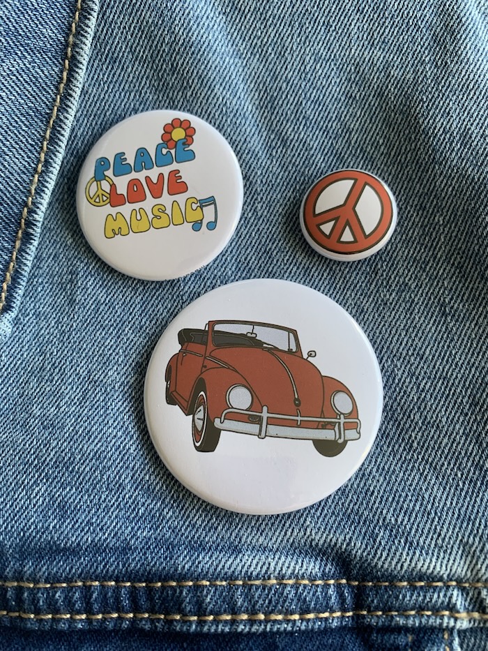 Design unique à Macarons Plus. Ensemble de 3 macarons thématiques hippie avec l’emblématique van Westfalia. Disponible en 8 couleurs pouvant s’harmoniser avec vos vêtements ou votre décor.
